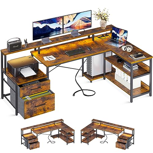 ODK L Shaped Desk with File Drawer, Power Outlet, LED Strip, & Storage Shelves