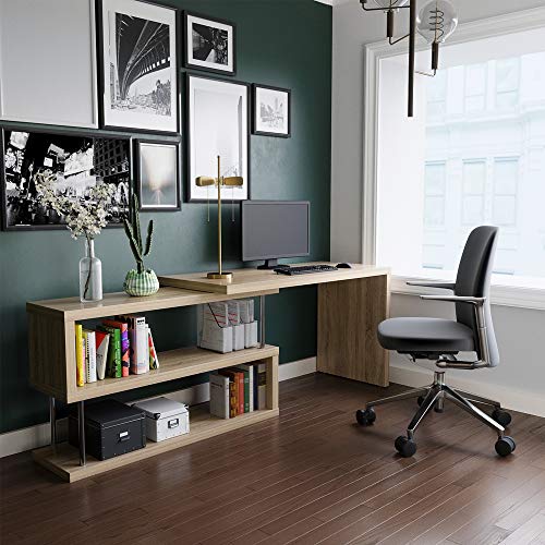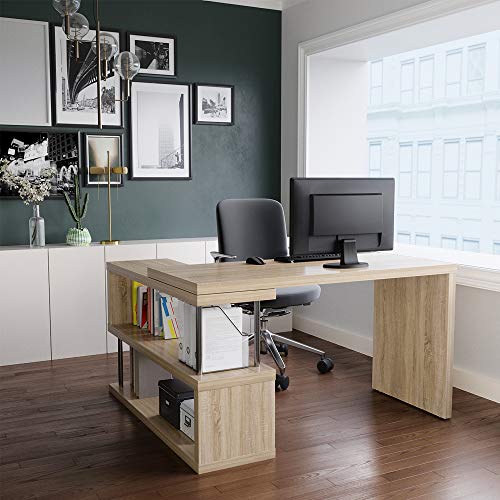 Details: Bestier L-Shaped Rotating Desk, 51" Large Storage Capacity Corner Desk with 2-Tier Open Storage Shelf, Lightweight Sturdy Hollow-Core Study Writing Table Double Workstation for Home Office (Oak)